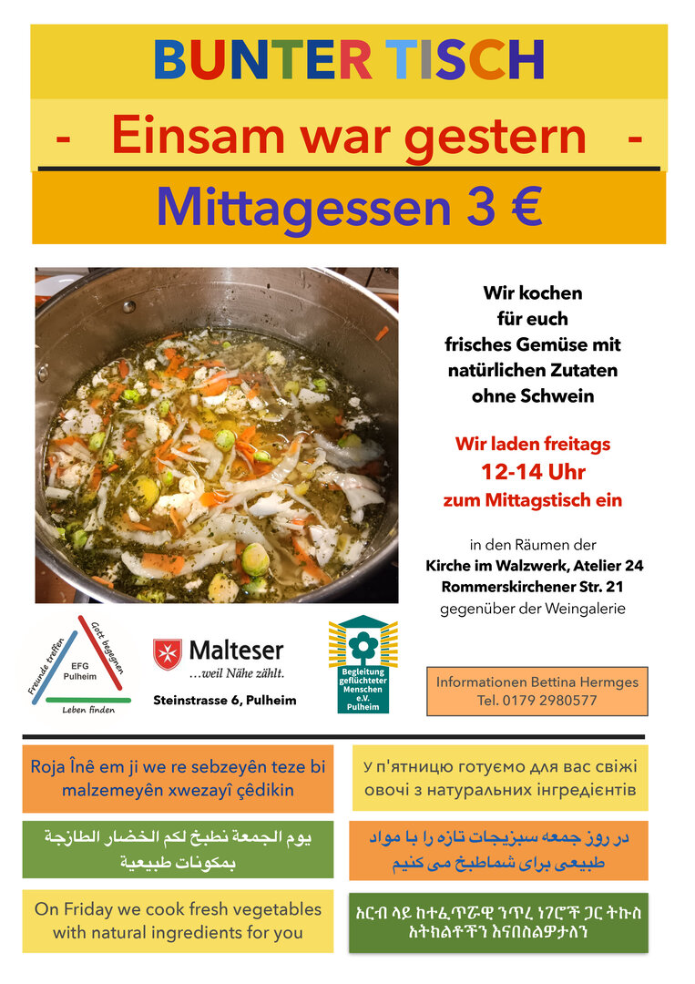 Einsamkeit war gestern - Wir kochen jeden Freitag wöchentlich wechselnde Menüs aus frischen Zutaten. In den Räumen der Kirche im Walzwerk treffen sich zwischen 12 und 14 Uhr Menschen, die Lust auf Geselligkeit beim gemeinsamen Mittagessen haben. Für einen Mindestbetrag von 3 Euro servieren wir Ihnen eine leckere Mahlzeit, Kaffee oder Tee und Wasser.